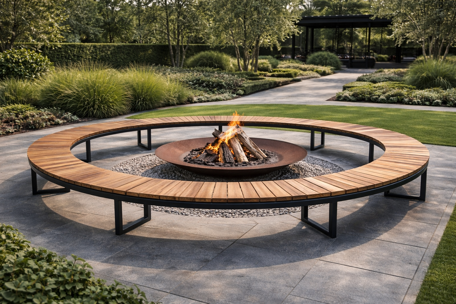 Okrągła ławka ogrodowa wokół paleniska – nowoczesna forma i ponadczasowa trwałość -Drewno Bukowe
