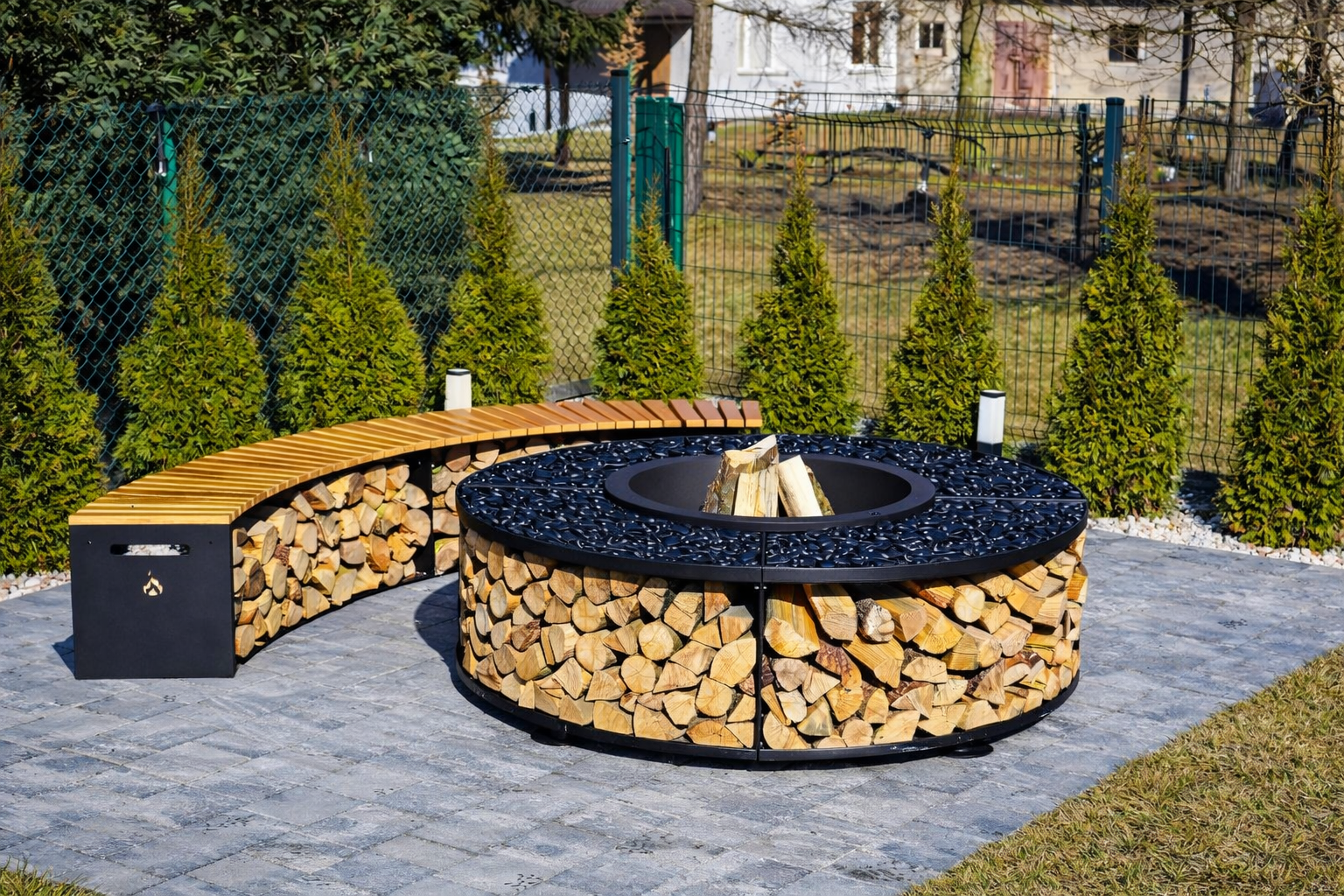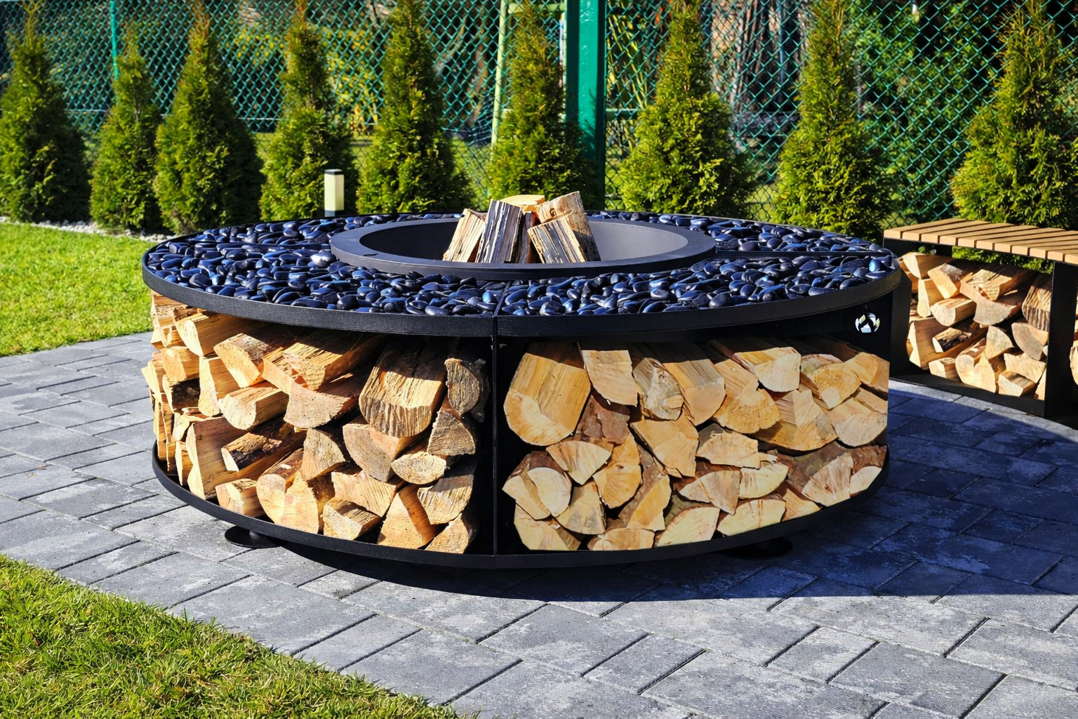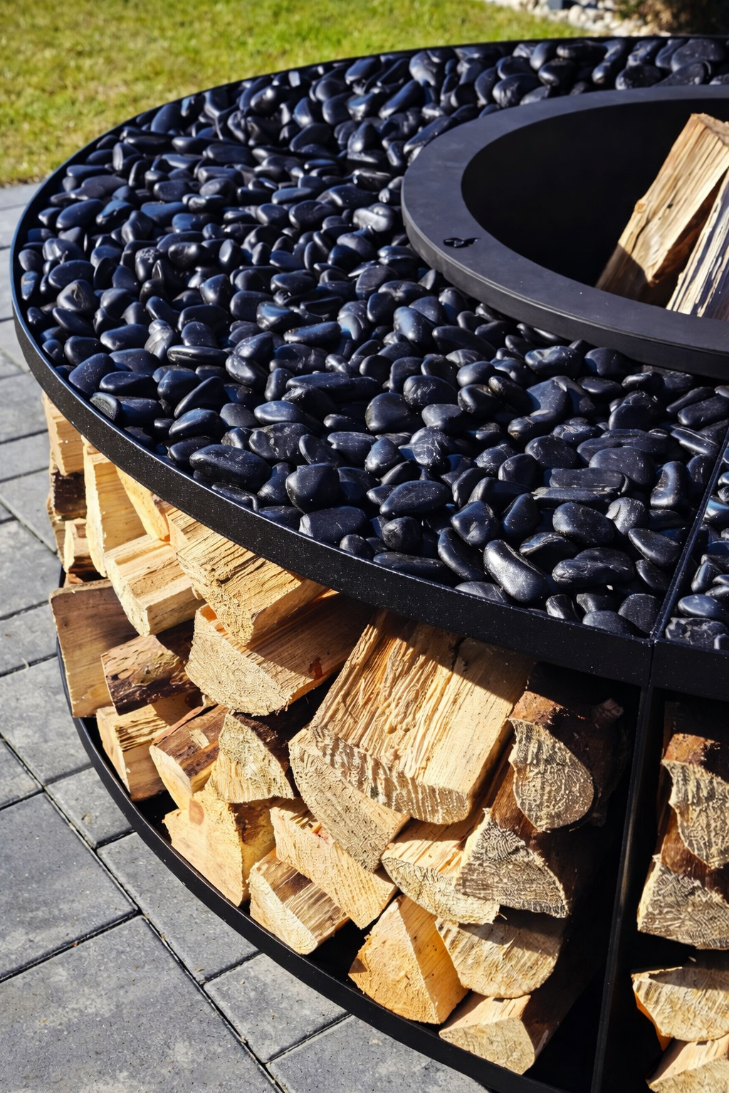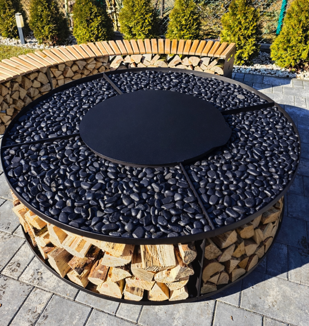 TITANIA wyróżnia się elegancką, minimalistyczną formą, która doskonale wpisuje się zarówno w nowoczesne, jak i klasyczne aranżacje ogrodowe. Okrągła konstrukcja z wbudowanymi boksami na drewno nie tylko wygląda efektownie, ale również zapewnia wygodny dostęp do opału – wszystko masz zawsze pod ręką. Dopełnieniem jest wypełnienie z czarnych polerowanych otoczaków
