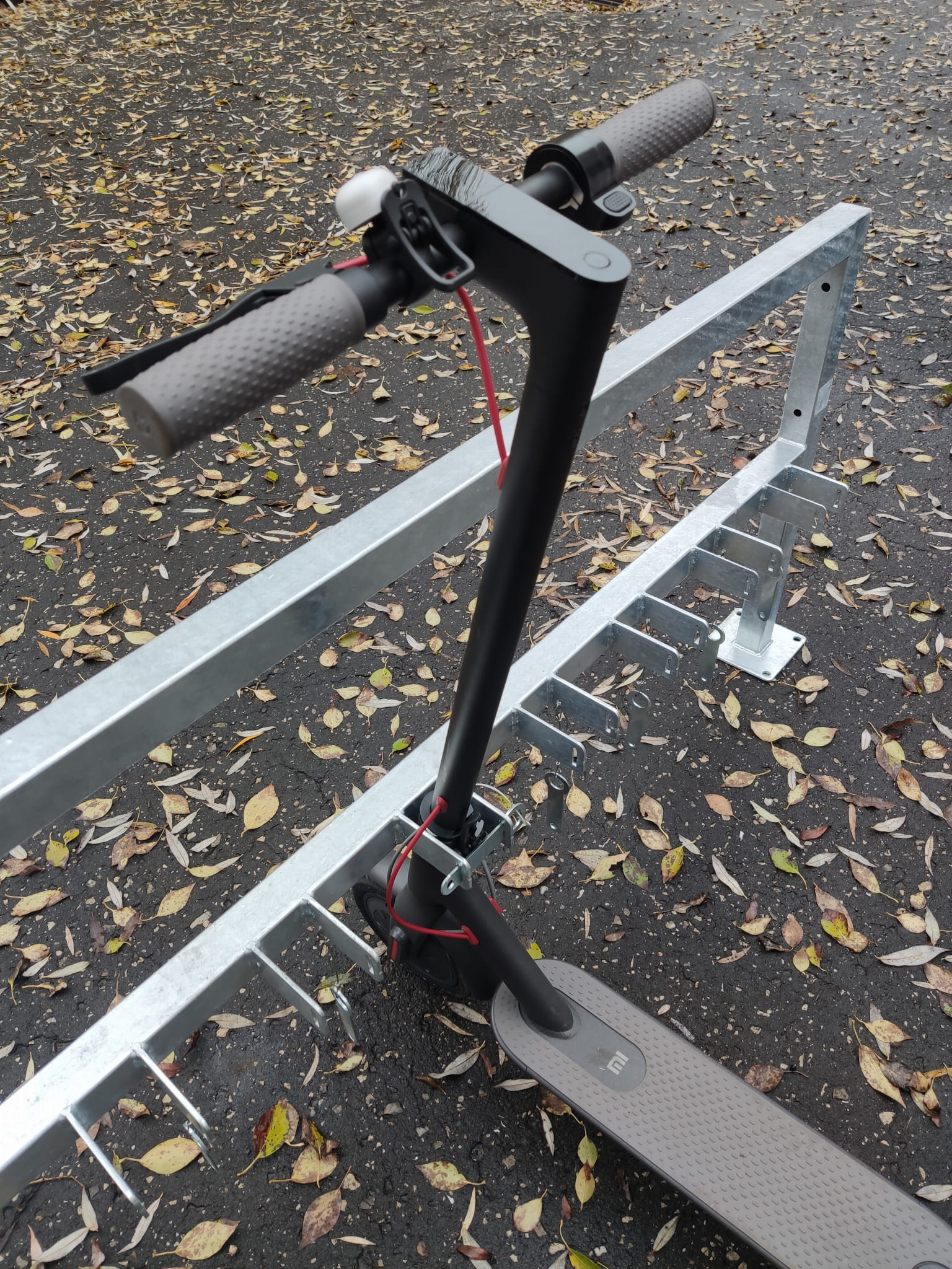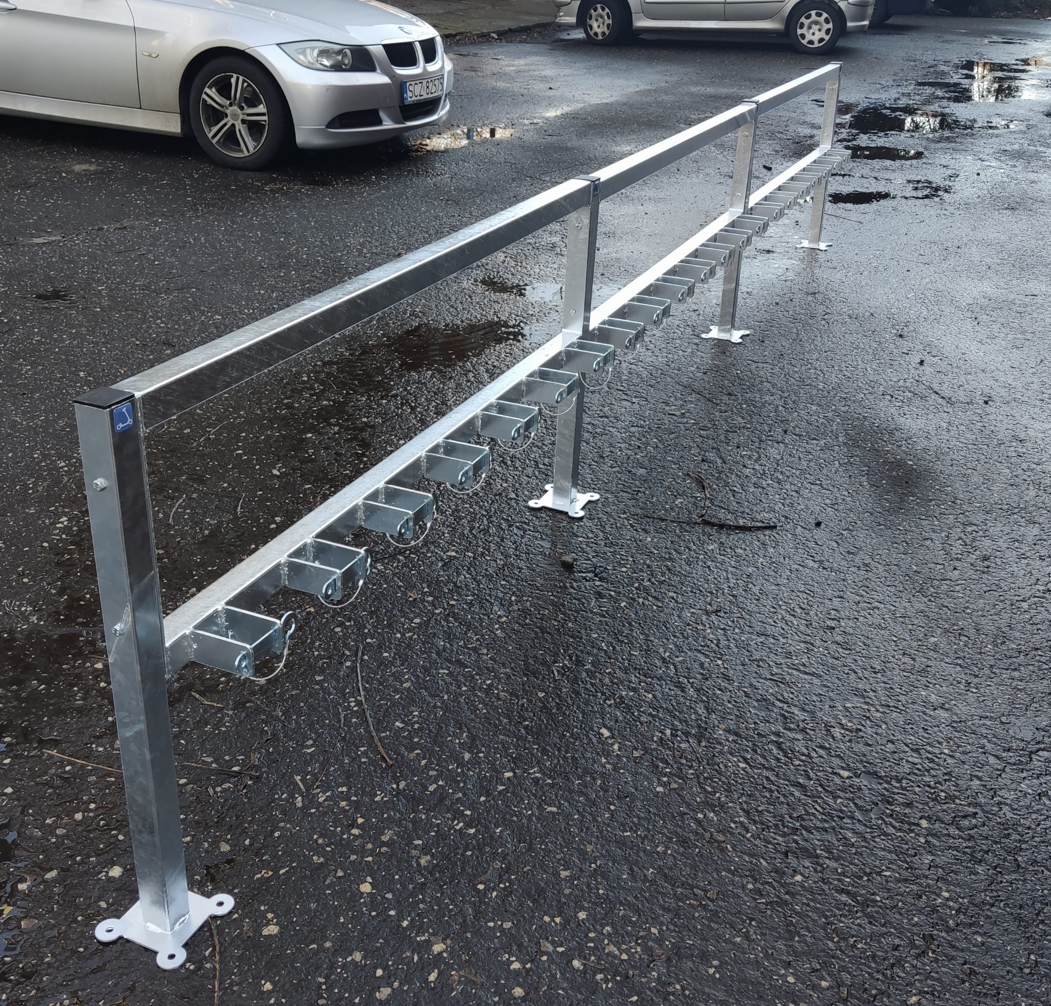 - Stojak z możliwością zapięcia również hulajnóg elektrycznych