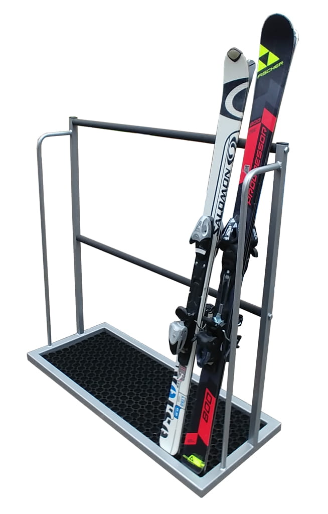 Stojak na narty z ociekaczem – Stojak postojowy opierany z wymiennym ogumowanym ociekaczem przeznaczony dla hoteli sklepów . Na prezentowanym stojaku mogą państwo przechować zarówno narty seniorskie jak i juniorskie . Dla potrzeb narciarni mogą państwo zamówić kółka do przemieszczania stojaka z systemem blokowania kół jezdnych. Stojak jest rozkręcany po sezonie można go w łatwy sposób przechować .