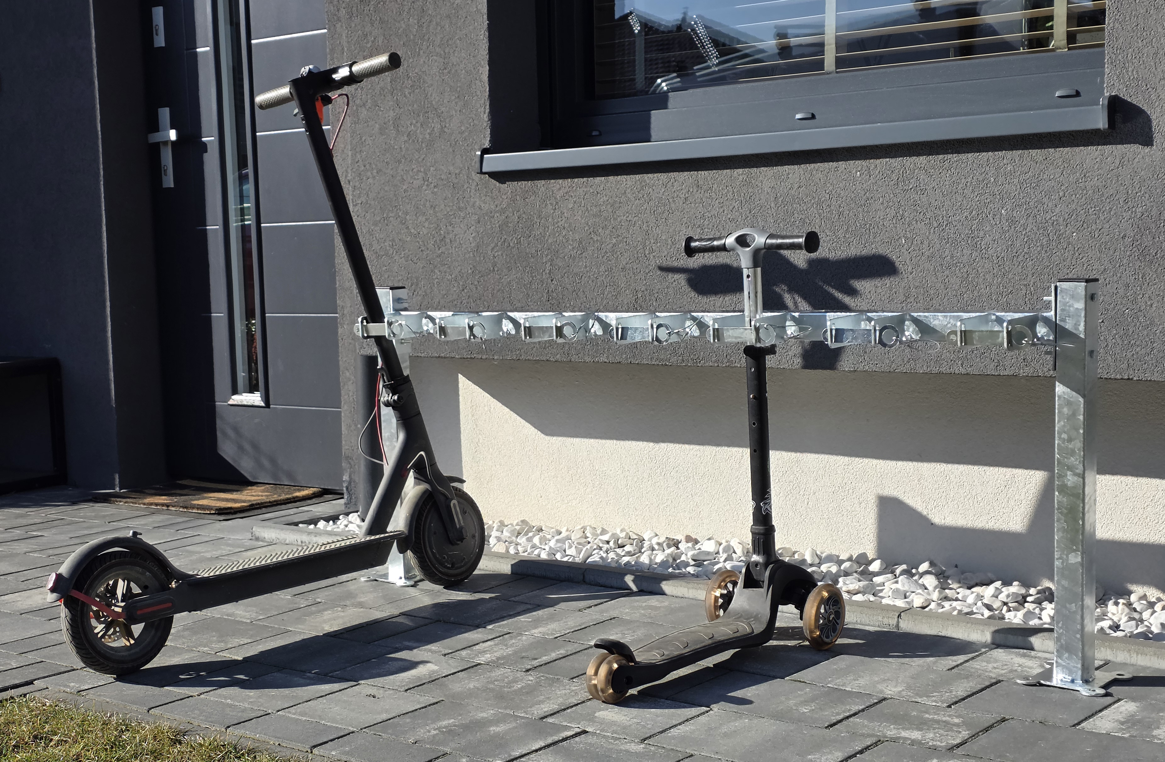 Solidny stojak przeznaczony do bezpiecznego parkowania aż 21 hulajnóg jednocześnie. Konstrukcja została zaprojektowana tak, aby obsługiwać zarówno hulajnogi elektryczne każdego typu, jak i klasyczne hulajnogi dziecięce oraz miejskie. Dzięki uniwersalnemu układowi uchwytów stojak umożliwia także przypięcie rowerków dziecięcych oraz rowerków biegowych, co czyni go idealnym rozwiązaniem dla szkół, przedszkoli, placów zabaw, osiedli mieszkaniowych czy przestrzeni publicznych.
