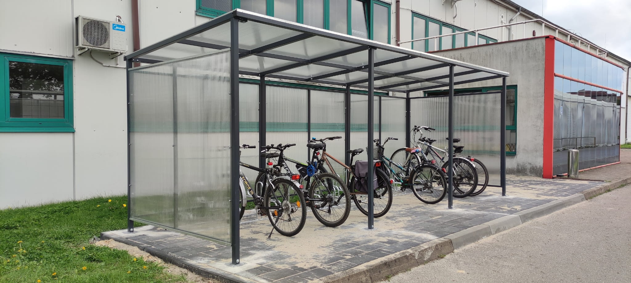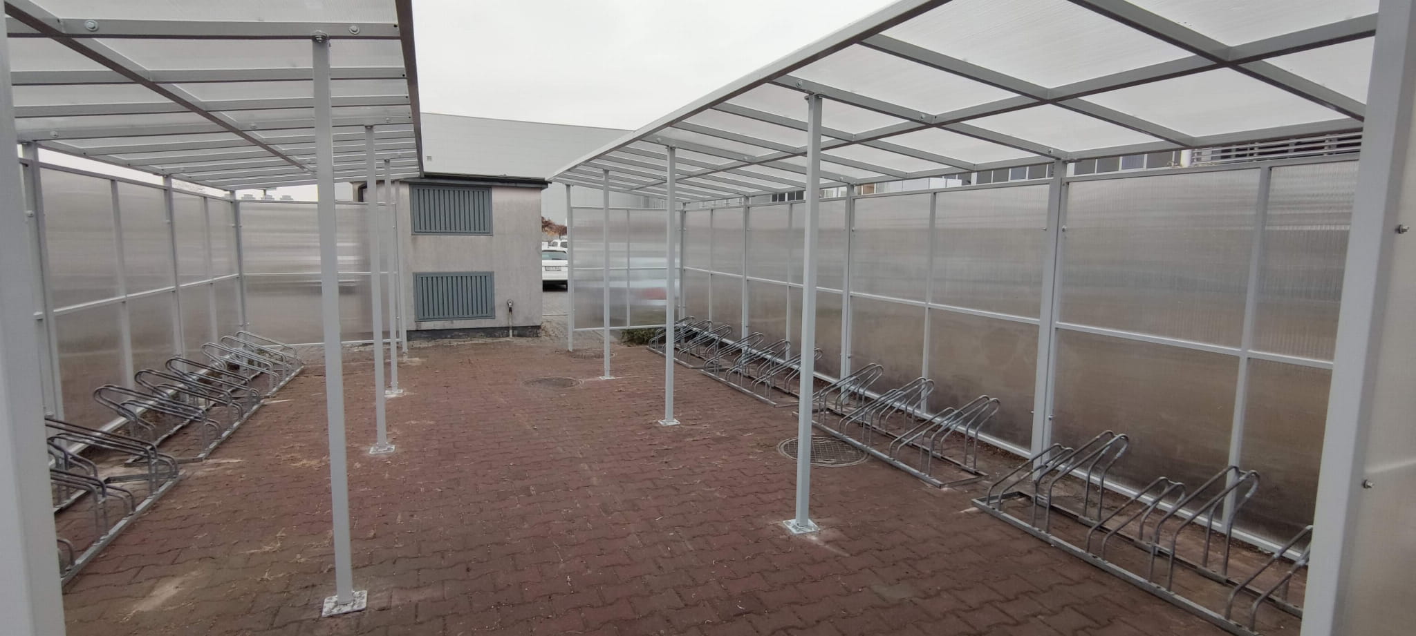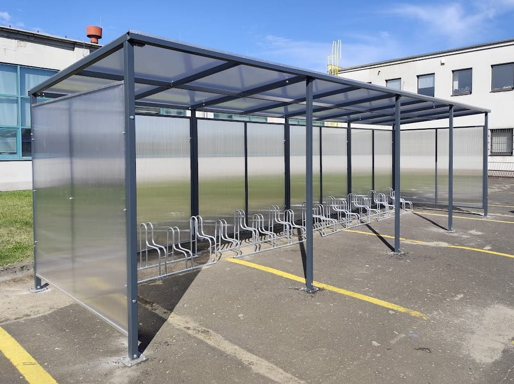 - Wiata o mocnej solidnej konstrukcji oszalowana z 3 boków aby zabezpieczyć rowery przed warunkami atmosferycznymi.