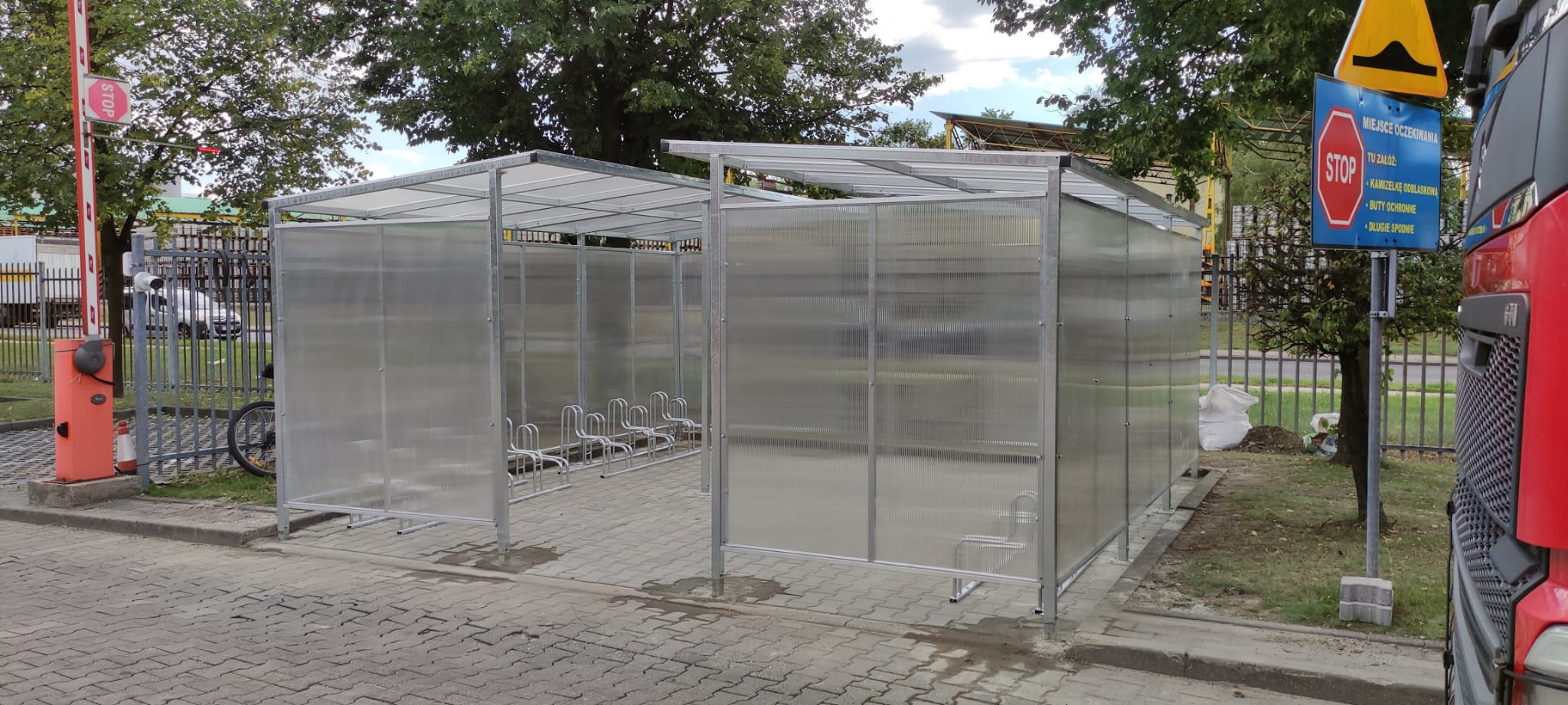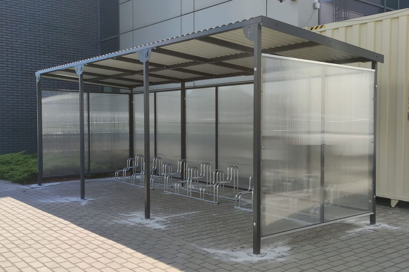 - Wiata o mocnej solidnej konstrukcji oszalowana z 3 boków aby zabezpieczyć rowery przed warunkami atmosferycznymi.