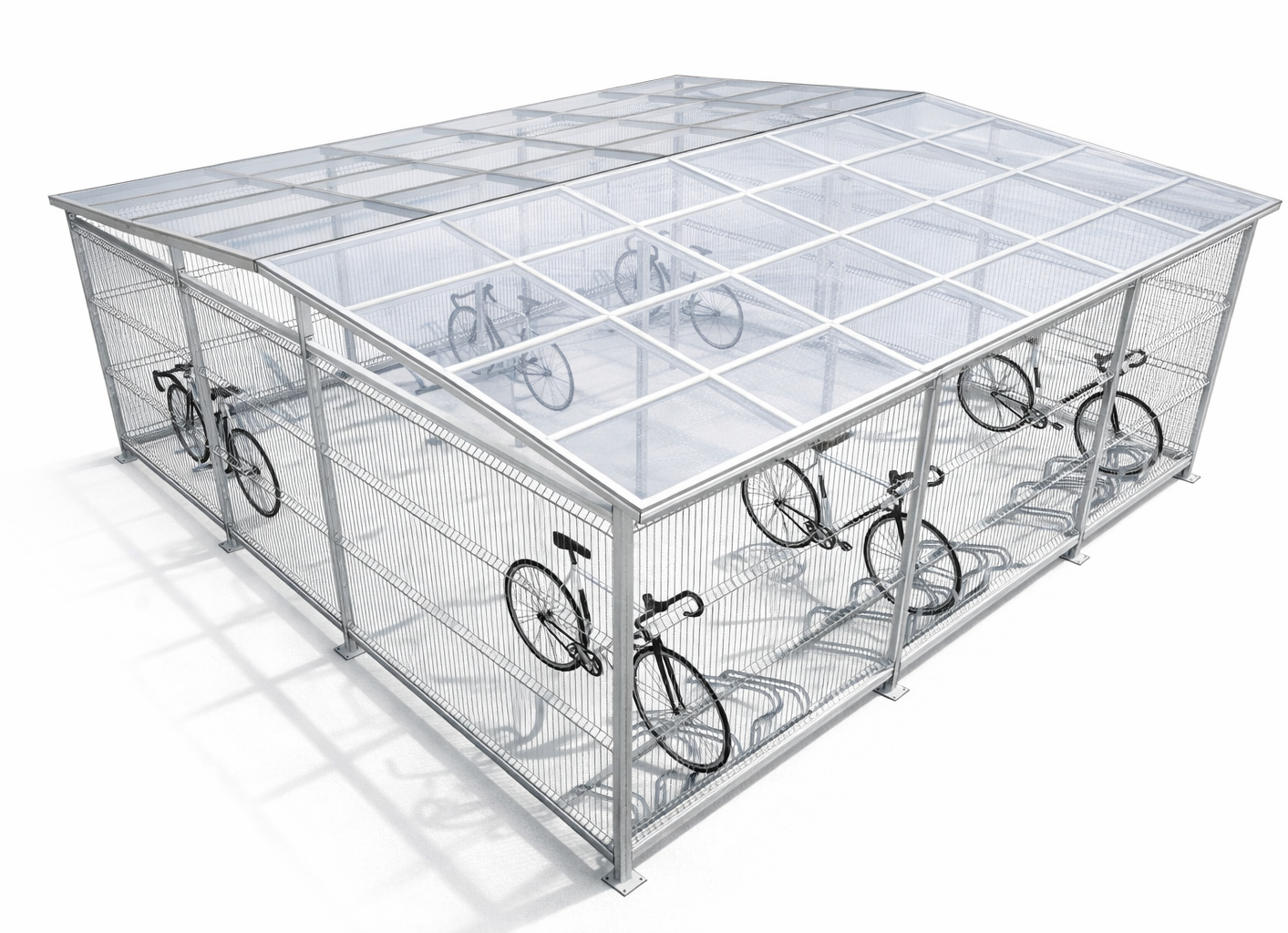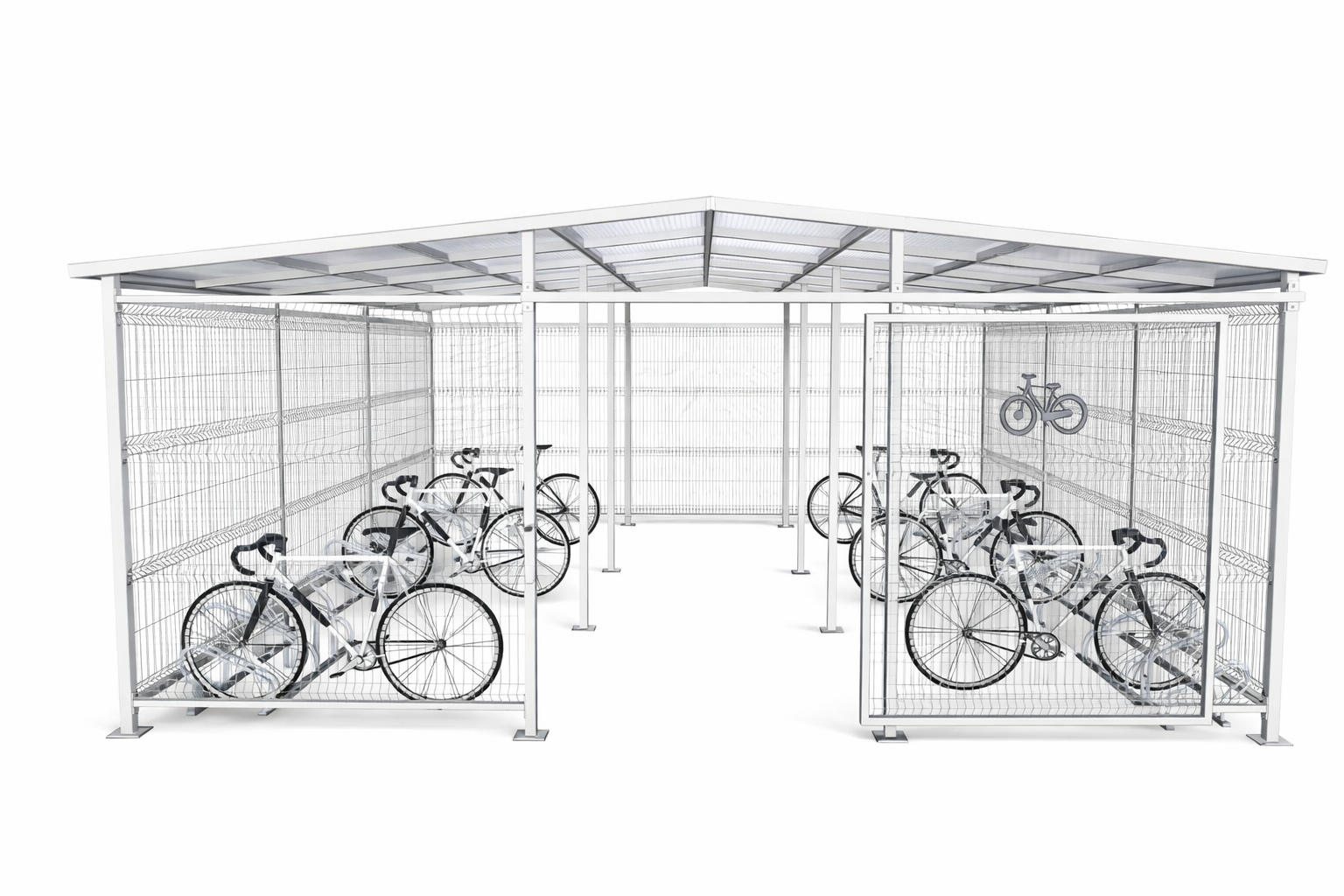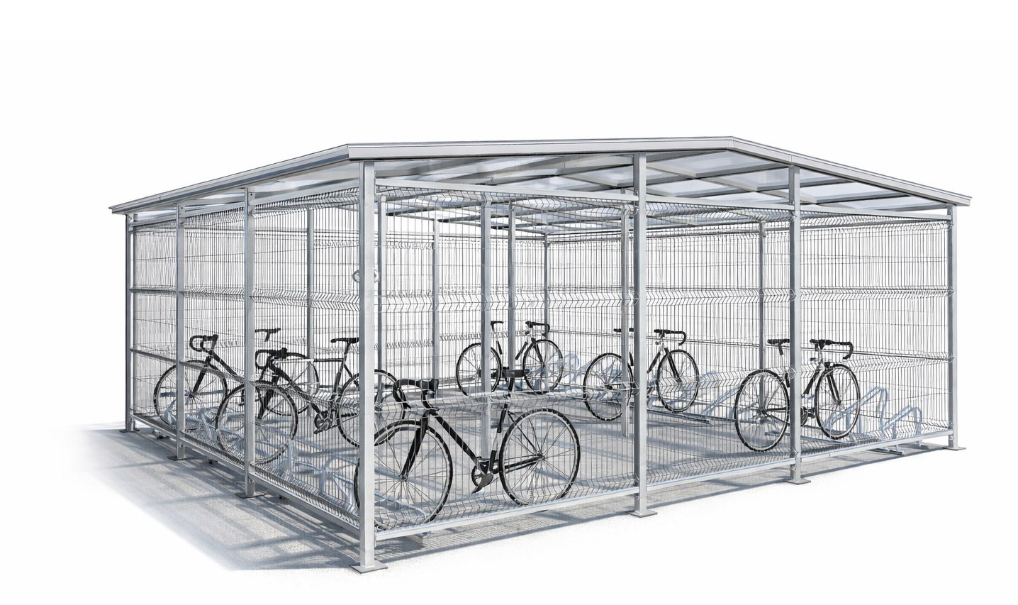 Ściany wiaty wypełnione są panelami siatkowymi o przekroju drutu 5mm które gwarantują dobrą wentylację oraz widoczność wnętrza, zwiększając bezpieczeństwo użytkowania. Dach wykonany z poliwęglanu komorowego skutecznie chroni rowery przed opadami atmosferycznymi, jednocześnie przepuszczając światło dzienne. Wiata może być również wykończona blachą trapezową.